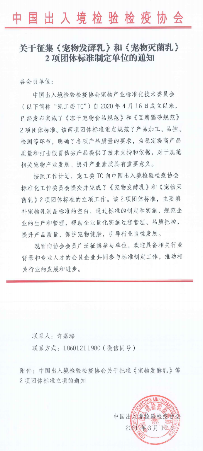 ÄúÏÖÔÚµÄλÖÃÊÇ£ºÊ×Ò³ > ¹¤×÷¶¯Ì¬Óë֪ͨ¹«¸æ ¹ØÓÚÕ÷¼¯¡¶³èÎï·¢½ÍÈé¡·ºÍ¡¶³èÎïÃð¾úÈé¡·2ÏîÍÅÌå±ê×¼ÖÆ¶¨µ¥Î»µÄ֪ͨ ·¢²¼ÈÕÆÚ£º2021-03-12 ×ÖÌ壺 ¡¾Ð¡¡¿ ¡¾ÖС¿ ¡¾´ó¡¿ Ïà¹Ø¸½¼þ£º ¹ØÓÚÕ÷¼¯¡¶³èÎï·¢½ÍÈé¡·ºÍ¡¶³èÎïÃð¾úÈé¡·2ÏîÍÅÌå±ê×¼ÖÆ¶¨µ¥Î»µÄ֪ͨ.pdf ·ÖÏí£º ÈÈÃÅÎÄÕ£º Íõл᳤»á¼ûÖпƺϷÊÖÇ»Ûũҵ¹ÈÒ»ÐÐ[2025-09-11] Öйú³öÈë¾³¼ìÑé¼ìÒßлá³Ð°ìµÄ2025Äê¶ÈCNASÈϿɼ¼ÊõÅàѵ°àÔÚÖÊÁ¿Ô¿ª°à[2025-09-10] Öйú³öÈë¾³¼ìÑé¼ìÒßлáË®³ß¼ÆÖØÅàѵÔÚÄϾ©Ô²ÂúÊÕ¹Ù£¬´ÓÒµÕß¹²´ÙÐÐÒµ¼¼ÊõÌáÉý[2025-08-28] ºÚÁú½Ê¡Çì°²ÏØÉú̬ԲúµØ²úÆ·±£»¤ÇøÕýʽÊÚÅÆ[2025-08-27] ÒÊÄÏÏØÈËÃñÕþ¸®¼°ÆóÒµ´ú±íµ½·Ãлá[2025-08-22] º£¹Ø×ÊѶ º£¹Ø×ÜÊ𹫸æ2025ÄêµÚ184ºÅ£¨¹ØÓÚ½ø¿Úºé¶¼À˹ҰÉúË®²úÆ·¼ìÑé¼ìÒߺÍÎÀÉúÒªÇóµÄ¹«¸æ£© º£¹Ø×ÜÊ𹫸æ2025ÄêµÚ183ºÅ£¨¹ØÓÚÖíÈâ¼°Öí¸±²úÆ·ÉÌÆ·±àºÅÉ걨ҪÇóµÄ¹«¸æ£© ¡°Ê®ËÄÎ塱ÒÔÀ´£¬È«¹úÐÂÔöºÍÀ©´ó¿ª·Å¿Ú°¶40¸ö¡ª¡ª311¸ö¿Ú°¶£¬¿ª·ÅͨµÀÔÙÀ©ÈÝ µ¥Ô³ö¿Ú¡°6Á¬ÕÇ¡± ÍâóÏÔÏÖ¡°Á¿ÉýÖÊÓÅ¡± ±±¾©Òàׯ×ۺϱ£Ë°ÇøÍ¨¹ý¹ú¼ÒÑéÊÕ ÖйúÓëÆäËû½ðש³ÉÔ±¹úóÒ×Ö¸ÊýÊ״η¢²¼ ǰ8¸öÔ½ø³ö¿ÚÔö³¤3.5% ¡°Ëæ³µ²éÑé¡¢ÃâϳµÍ¨¹Ø¡±Ä£Ê½ÍƳö ÇٰĿ羳ѧÉúר³µ¾ÅÔÂÒ»ÈÕ¿ªÍ¨