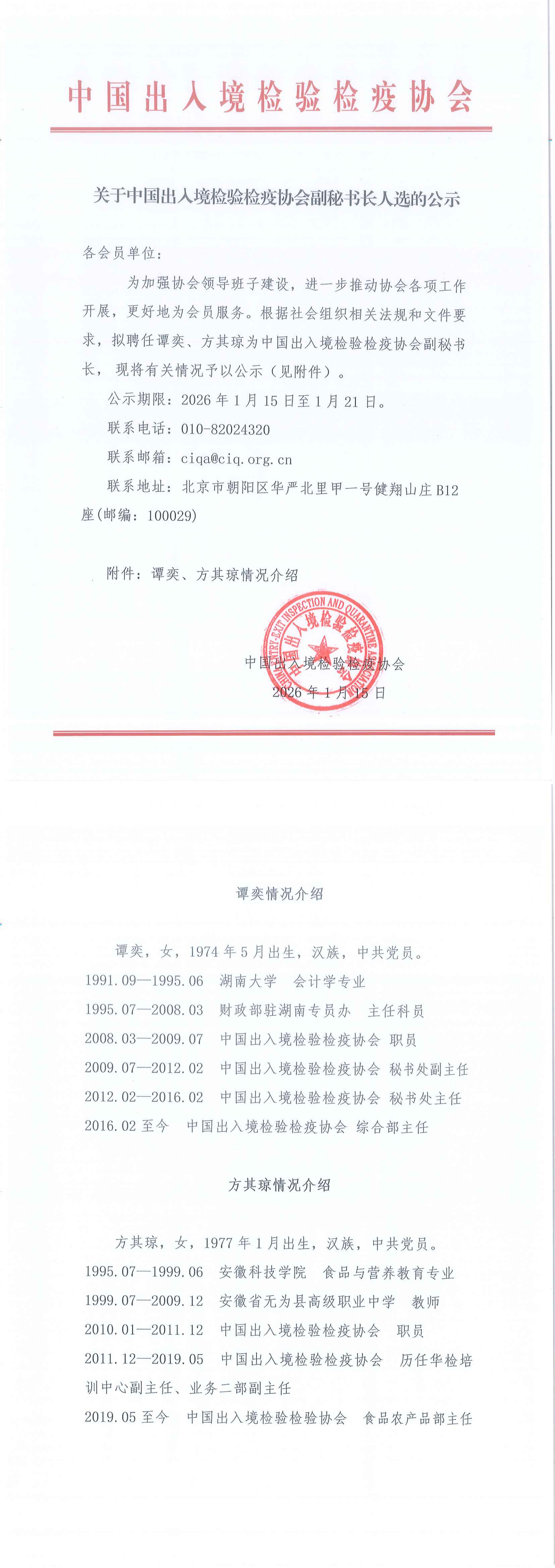 您现在的位置是:首页 > 工作动态与通知公告 关于中国出人境检验检疫协会副秘书长人选的公示 发布日期:2026-01-15 字体: 【小】 【中】 【大】 分享: 热门文章: 接棒启新航 聚力向未来 | 中国出入境检验检疫协会第六届第一次会员代表大会[2026-01-28] 检测和校准实验室认可技术培训班在西安成功举办[2025-12-16] 重磅!中国出入境检验检疫协会国际贸易便利化分会正式成立[2025-11-22] 第七届国际检博会圆满举办:链动全产业链,共启检验检测新生态[2025-11-17] 中国出入境检验检疫协会参加第八届中国国际进口博览会及相关活动[2025-11-11] 海关资讯 2025年港珠澳大桥口岸进出口货值超3000亿元 去年全国海关查获外来物种5439批次——防范口岸入侵风险取得突出成效 覆盖全球约1/3经济总量,RCEP正式生效四年了——“家门口”的外贸生意越来越旺 粤港澳大湾区内地九市外贸规模创历史新高 海关总署公告2026年第12号(关于启动进出口货物多式联运(海铁、水水部分)业务模式试点相关事项的公告) 海关总署 农业农村部公告2026年第11号(关于解除巴西南里奥格郎德州新城疫疫情禁令的公告) “十五五”时期海关将适度扩大进口 海南自贸港封关运作“满月”